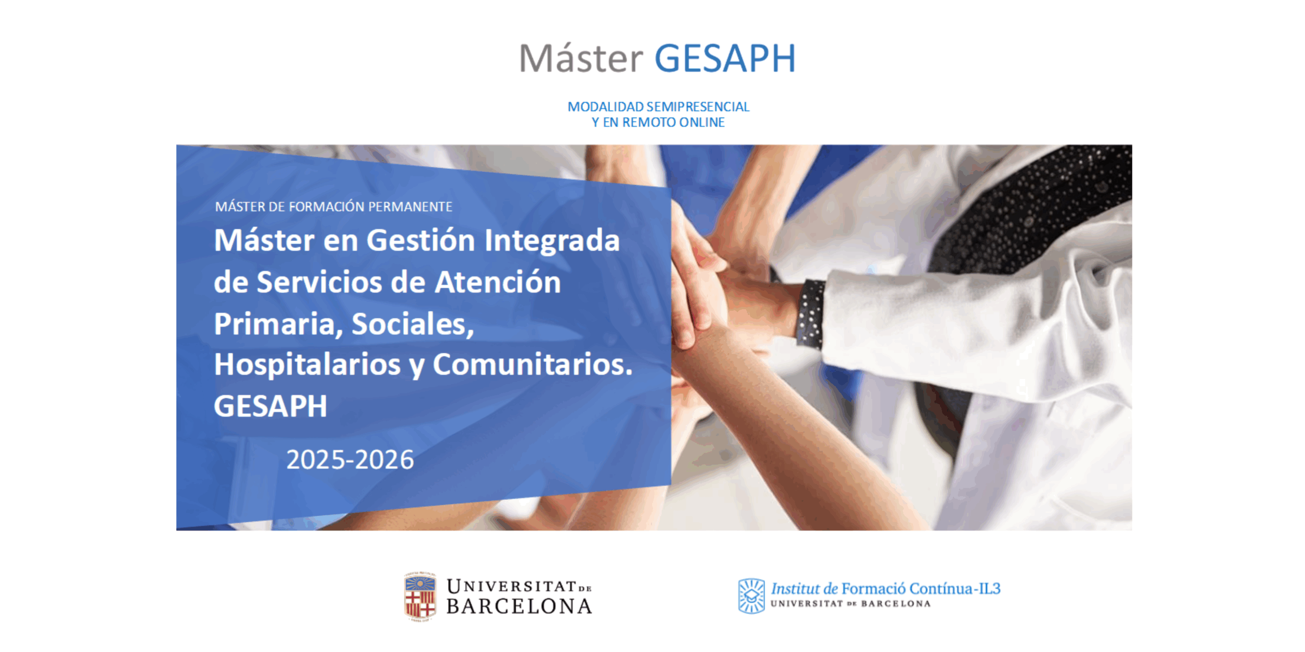 El Máster GESAPH 2025–2026 en Gestión Integrada de Servicios de Atención Primaria, Sociales, Hospitalarios y Comunitarios es un programa de formación permanente de la Universidad de Barcelona (IL3) diseñado para preparar a profesionales capaces de dar respuesta a los retos actuales del sistema sanitario y social.
